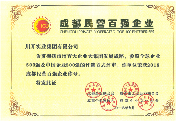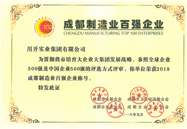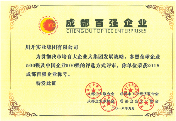 11月13日,成都企業(yè)聯(lián)合會(huì)、成都市工業(yè)經(jīng)濟(jì)聯(lián)合會(huì)發(fā)布“2018成都企業(yè)100強(qiáng)”榜單,川開實(shí)業(yè)集團(tuán)有限公司榮獲“2018年成都企業(yè)100強(qiáng)企業(yè)”(排名86位)、“2018年成都制造業(yè)100強(qiáng)”(排名39位)、“2018年成都民營企業(yè)100強(qiáng)”(排名36位)榮譽(yù)稱號。