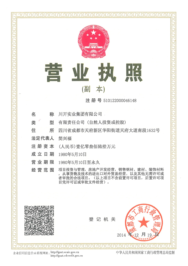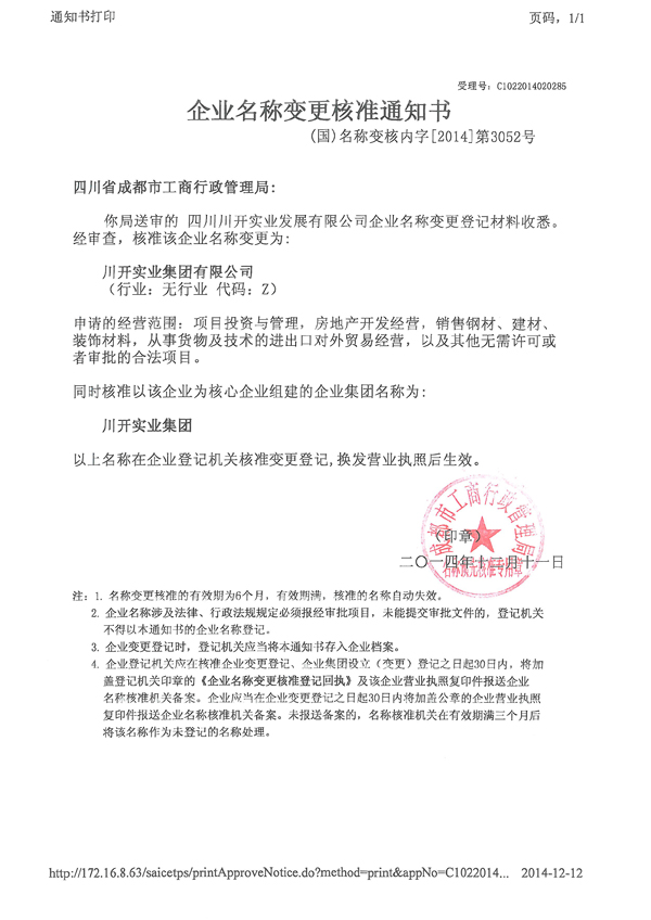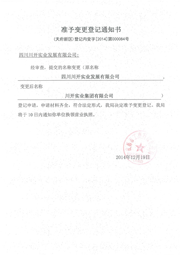 為了更好適應集團運營管理需要,經(jīng)國家工商行政管理總局核準,成都市工商行政管理局受理批準,“四川川開實業(yè)發(fā)展有限公司”名稱現(xiàn)已變更為“川開實業(yè)集團有限公司”,簡稱“川開實業(yè)集團”。
