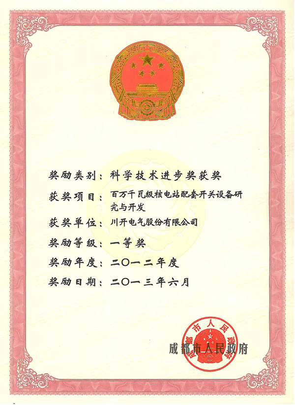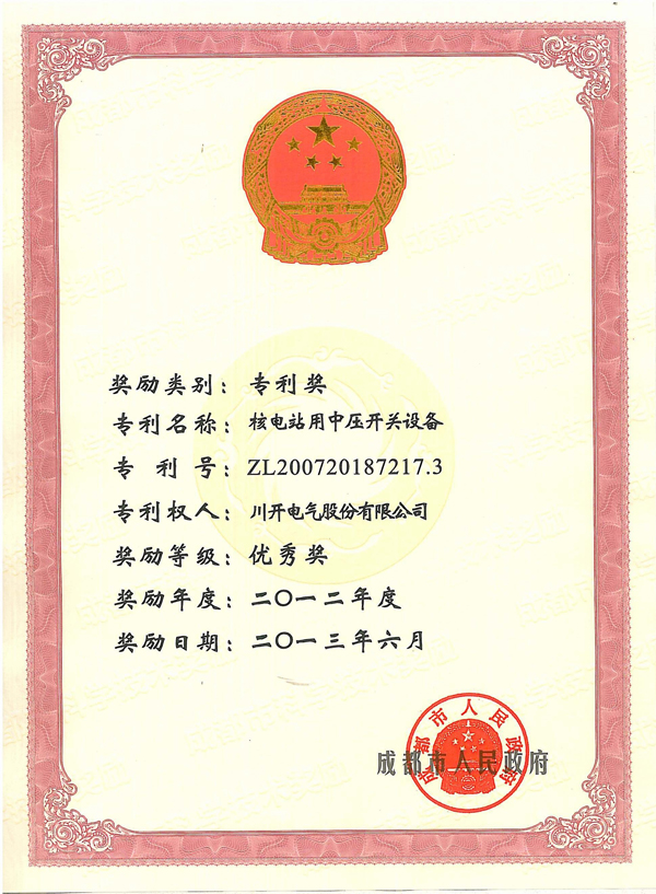 集團(tuán)所屬子公司川開電氣股份有限公司實(shí)施的“百萬(wàn)千瓦級(jí)核電站配套開關(guān)設(shè)備研究與開發(fā)項(xiàng)目”榮獲成都市科學(xué)技術(shù)進(jìn)步獎(jiǎng)一等獎(jiǎng),“核電站用中壓開關(guān)設(shè)備專利”榮獲成都市專利獎(jiǎng)優(yōu)秀獎(jiǎng)。