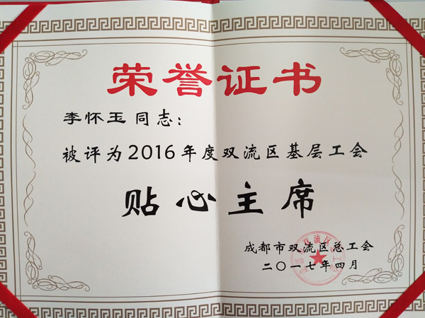 過(guò)去一年,集團(tuán)工會(huì)在維護(hù)職工合法權(quán)益、構(gòu)建和諧勞動(dòng)關(guān)系、促進(jìn)公司的生產(chǎn)經(jīng)營(yíng)方面做了大量的工作,受到上級(jí)工會(huì)的充分肯定,工會(huì)主席李懷玉同志被評(píng)為2016年度雙流區(qū)基層工會(huì)“貼心主席”。