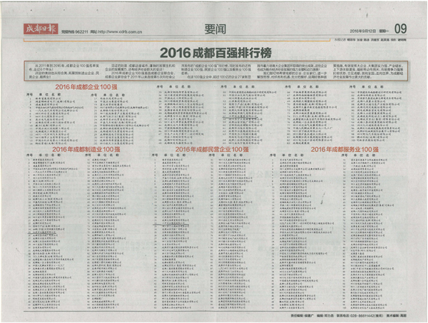 近日,從成都企業(yè)聯(lián)合會、成都市工業(yè)經(jīng)濟聯(lián)合會發(fā)布“2016成都企業(yè)100強”榜單,我集團榮獲“2016年成都企業(yè)100強企業(yè)”(排名57位)、“2016年成都制造業(yè)100強”(排名25位)、“2016年成都民營企業(yè)100強”(排名22位)榮譽稱號。