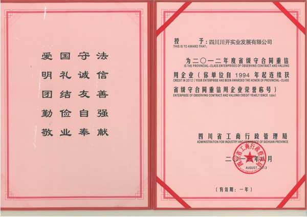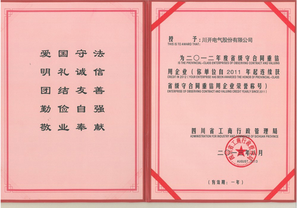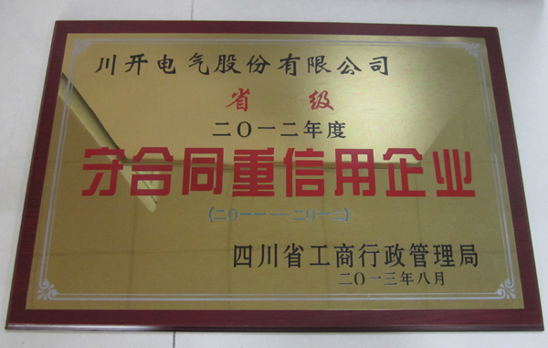 川開(kāi)電氣榮獲2012年度省級(jí)守合同重信用企業(yè)榮譽(yù)稱號(hào)