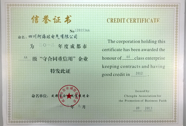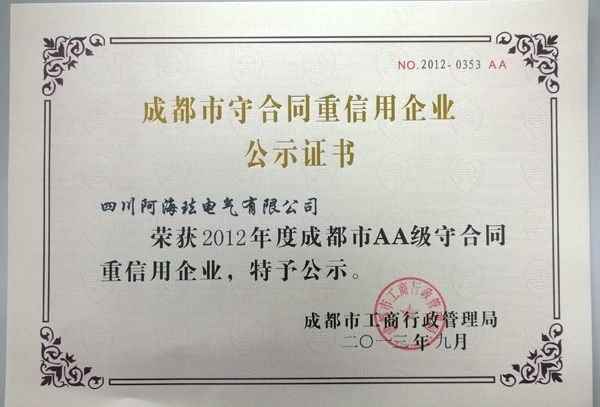多年來(lái),集團(tuán)公司始終把誠(chéng)信守法作為企業(yè)發(fā)展的重要基石,堅(jiān)持依法經(jīng)營(yíng),通過(guò)強(qiáng)化產(chǎn)品質(zhì)量保證、品牌形象,不斷完善售后服務(wù)工作,牢固樹(shù)立了以誠(chéng)取信、以信取譽(yù)、以譽(yù)取益的經(jīng)營(yíng)理念,健全完善合同信用管理體系,該項(xiàng)工作得到了客戶群、省、市、縣政府部門(mén)的充分認(rèn)可和高度評(píng)價(jià),連年獲得表彰和殊榮。今年8月,集團(tuán)公司、集團(tuán)所屬川開(kāi)電氣股份有限公司、四川阿海琺電氣有限公司再次被評(píng)為市級(jí)和省級(jí)“重合同守信用”企業(yè)。